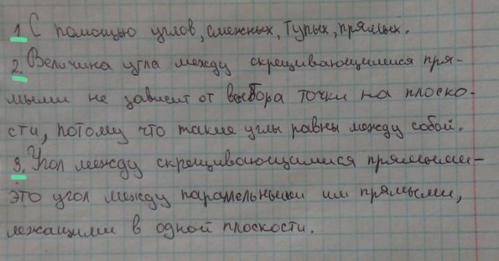 Письменно отвечаем в тетради на вопросы: 1. С помощью какого свойства доказали равенство углов с сонаправленными сторонами 2. Зависит ли величина угла между скрещивающимися прямыми от выбранной точки на плоскости? Если да, то почему? Если нет, почему? 3. Что называют углом между скрещивающимися прямыми?