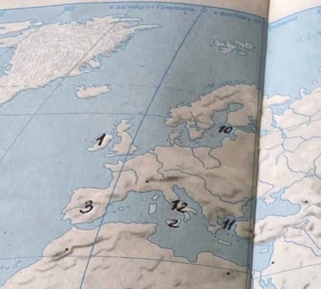 1 - острів Ірландія , 2 - острів Сицилія , 3 - Піренейський півострів , 12 - Апенінський півострів , 10 - острів Сааремаа або Балтійське море , 11 - Егейське море