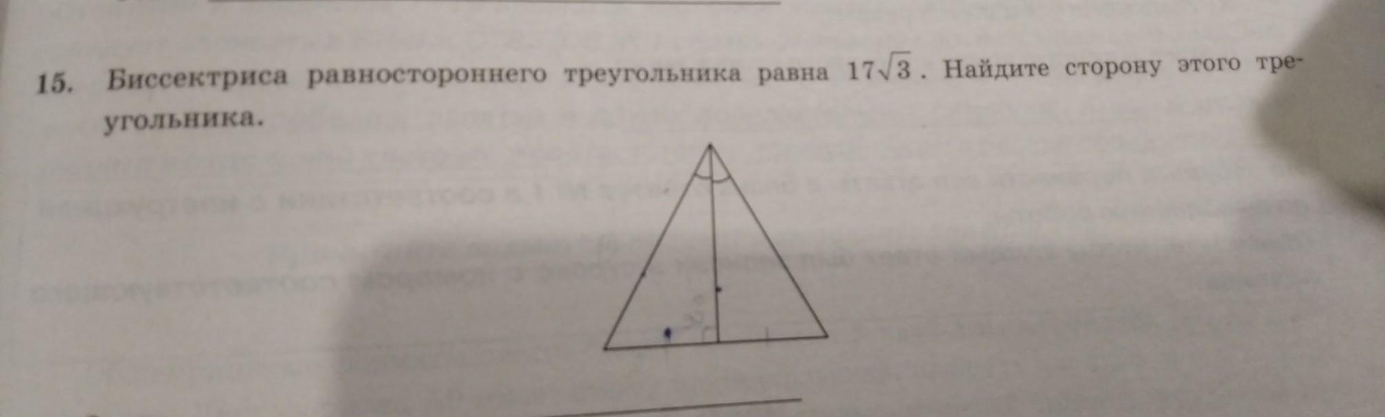 Дальше все очень просто, если вы не знаете тригонометрии - ничего страшного. Эта биссектриса делит тр-к на два прямоугольных. Ну вот скажем левый. У него гипотенуза - это боковая сторона, один катет - половина стороны, другой - высота. А у исходного тр-ка все стороны равны. Значит h^2 + (a/2)^2 = a^2; => h^2 = (3/4)a^2; => h = (√3/2)a; => a = 34;