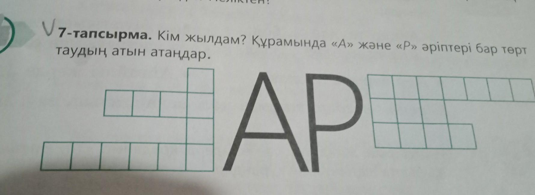 V7-тапсырма. Кім жылдам? құрамында «А» және «А» әріптері бар те таудың атын атаңдар. AP