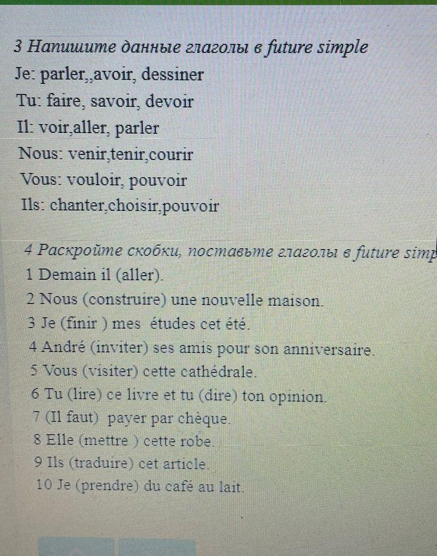 4. 1)ira 2)construirons 3)finirai 4)invitera 5)visiterez 6)liras 7)il faudra 8)mettra 9)traduiront 10)prendrai