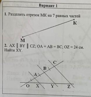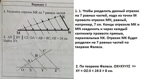 1. Чтобы разделить данный отрезок на 7 равных частей, надо из точки М провести отрезок МN, равный, например, 7 см. Концы отрезклв MK и MN соединить и через каждый сантиметр провести прямые, параллельные NK. Отрезок MK будет разделен на 7 равных частей по теореме Фалеса.