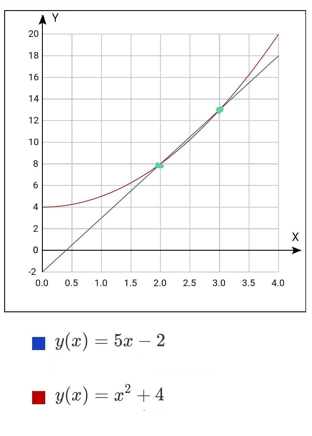 пересекаются ли прямая y=5x-2 и парабола y=x^2+4 если точки пересечения существуют, то найдите их координаты