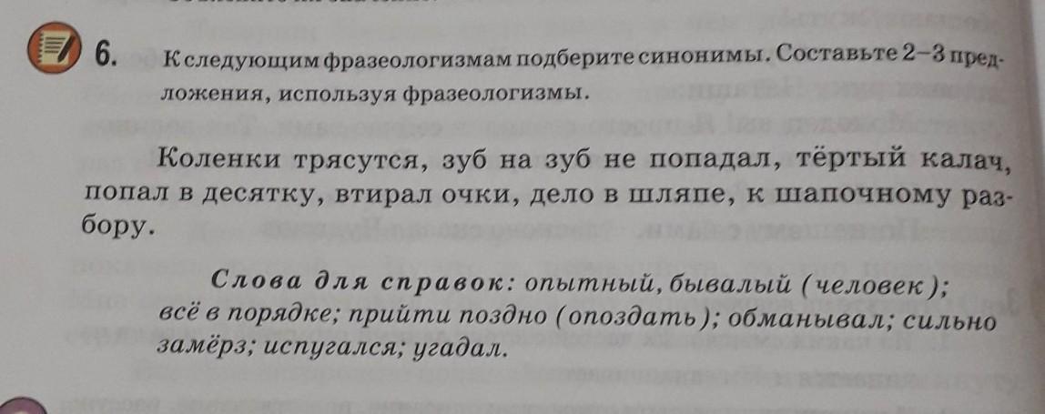 Ответ:Коленки трясутся-испугался,зуб на зуб не попадал- замерз,тертый калач-опытный,попал в десятку-угадал,втирал очки-обманывал,дело в шляпе-все в порядке,к шапочному разбору-опоздать