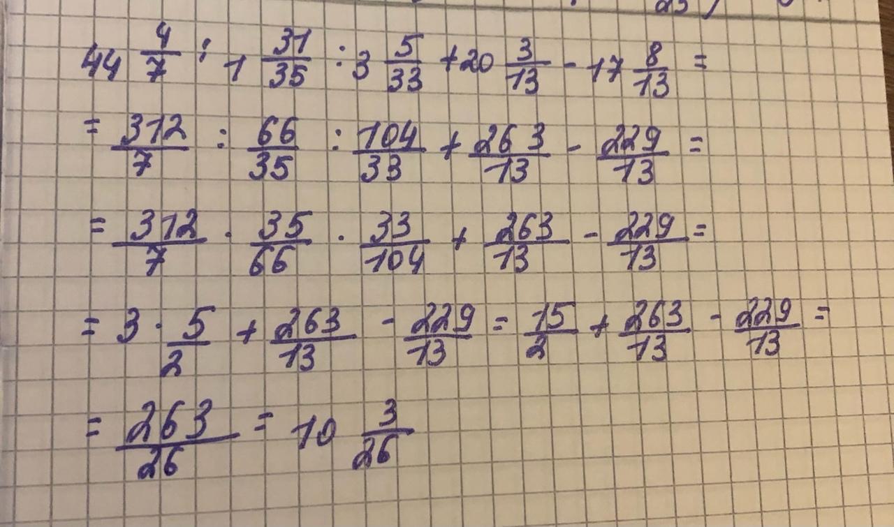 260/11 : 104/33 = 260/11 * 33/104 = 5/1 * 3/2 = 15/2 = 7. 1/2