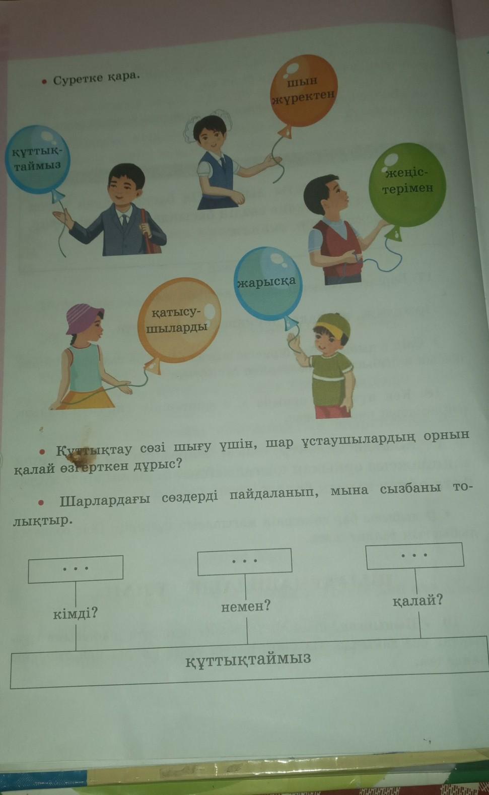С2 нутгаа • Суретке қара. ШЫН жүректен құттық- таймыз жеңіс- терімен жарысқа қатысу- шыларды • Куттықтау сөзі шығу үшін, шар ұстаушылардың орнын қалай өзгерткен дұрыс? Шарлардағы сөздерді пайдаланып, мына сызбаны то- лықтыр. калай? немен? кімді? құттықтаймыз