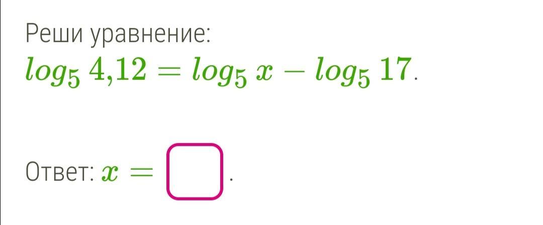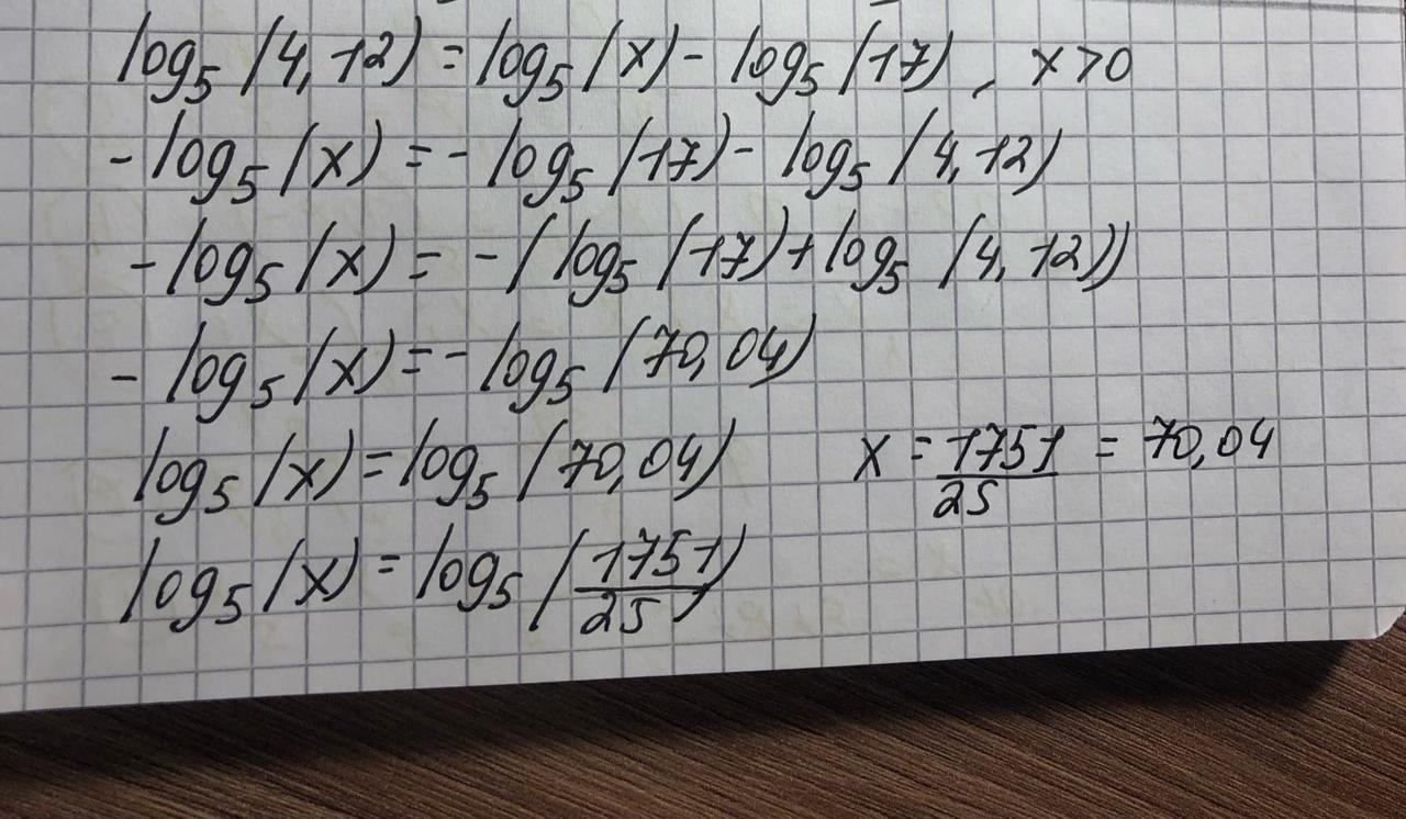 Вынесем знак минуса за скобки: -log5 (x) = -(log5 (17) + log5 (4,12)).