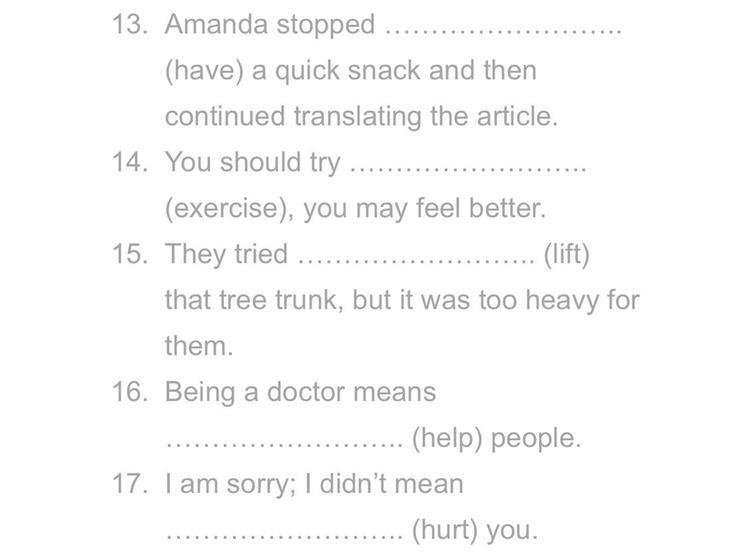 Amanda stopped to have a quick snack and then continued translating the article.(Stop + to + infinitive means that someone or something stops an activity so that they can do something else. Stop + -ing means the action is not happening any more.)