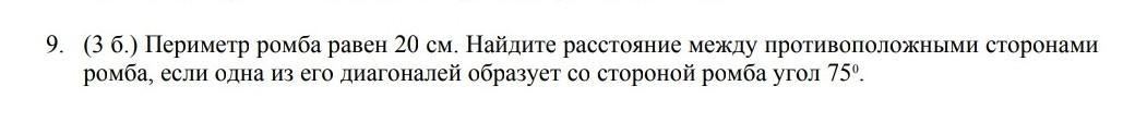 Дано: СКМТ - ромб, КТ и СМ - диагонали. ∠КТМ=75°, Р=20 см. Найти КН.