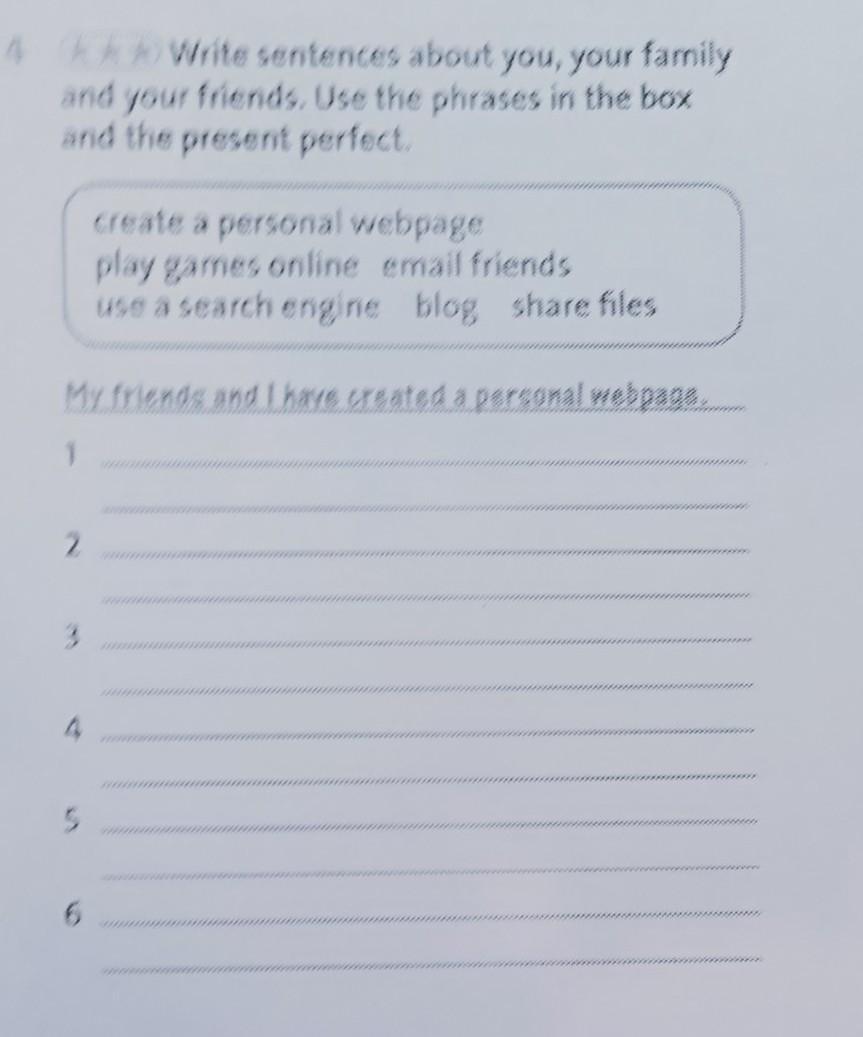 4 Write sentences about you, your family and your friends. Use the phrases in the box and the present perfect, create a personal webpage play games online email friends use a search engine blog share files My friends and I have created a personal webpage 1 2 3 5 >>>> 6