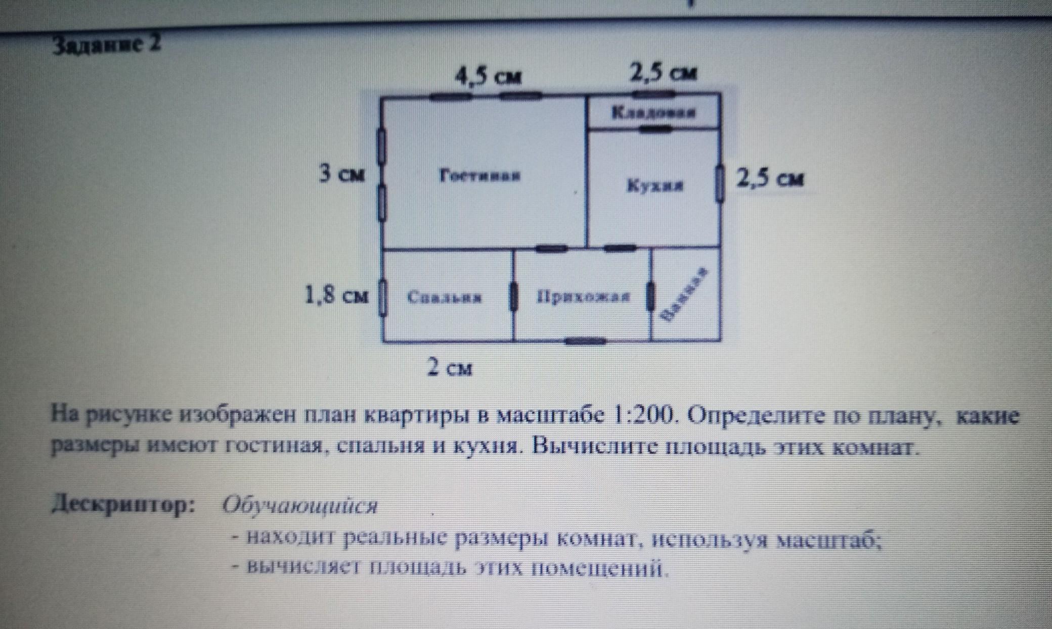 на рисунке изображен план квартиры в масштабе 1:200. определите по плану, какие размеры имеют гостиная, спальня и кухня, вычислите площадь этих комнат.