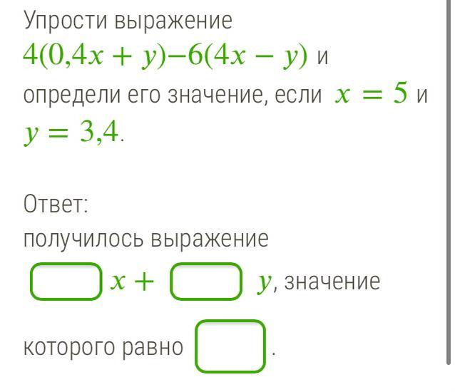 Упрости выражение 4(0,4+)−6(4−) и определи его значение, если =5 и =3,4.