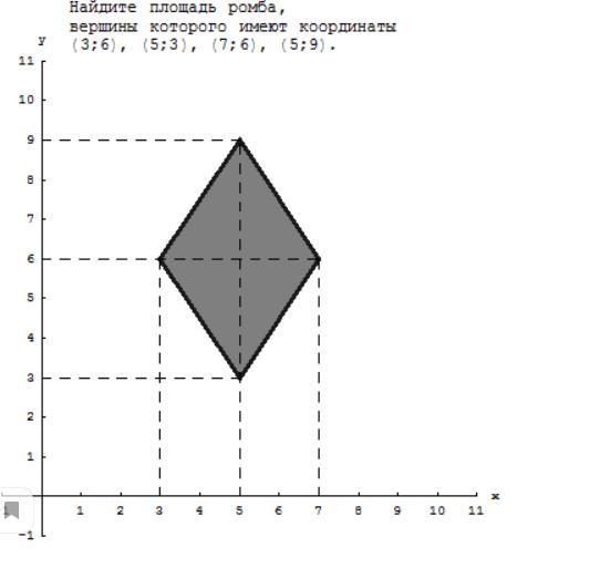 S = 1/2 * ( 9 - 3 ) * ( 7 - 3 ) = 1/2 * 6 * 4 = 3 * 4 = 12 квадратных единиц.