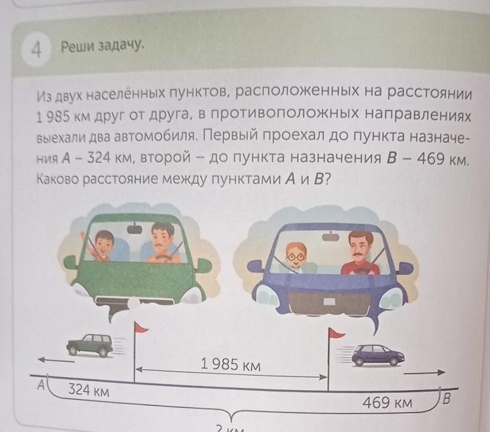 4 Реши задачу. Из двух населенных пунктов, расположенных на расстоянии 1985 км друг от друга, в противоположных направлениях выехали два автомобиля. Первый проехал до пункта назначен ния А - 324 км, второй – до пункта назначения В – 469 км Каково расстояние между пунктами А и В? 1985 км A 324 км В 469 км 2 км