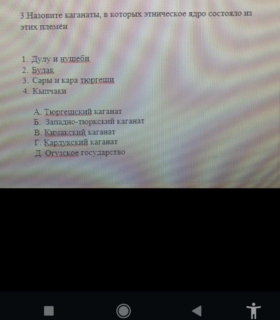 3.Назовите каганаты, в которых этническое ядро состояло из этих племеён 1. Дулу и нушеби 2. Булак 3. Сары и кара 1юргеци 4. Кыпчаки А. Тюргешский каганат Б. Западно-тюркский каганат В. Кичакский каганат Г. Карлукский каганат огузское государство