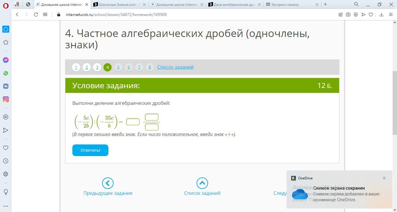 СРОЧНО Выполни деление алгебраических дробей: (−5c/2b):(−35c/b)= (В первое окошко введи знак. Если число положительное, введи знак «+»).