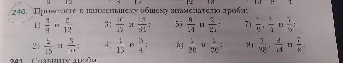 3/8 и 5/12 = Общий меньший знаменатель 24. 9/24 и 10/24.