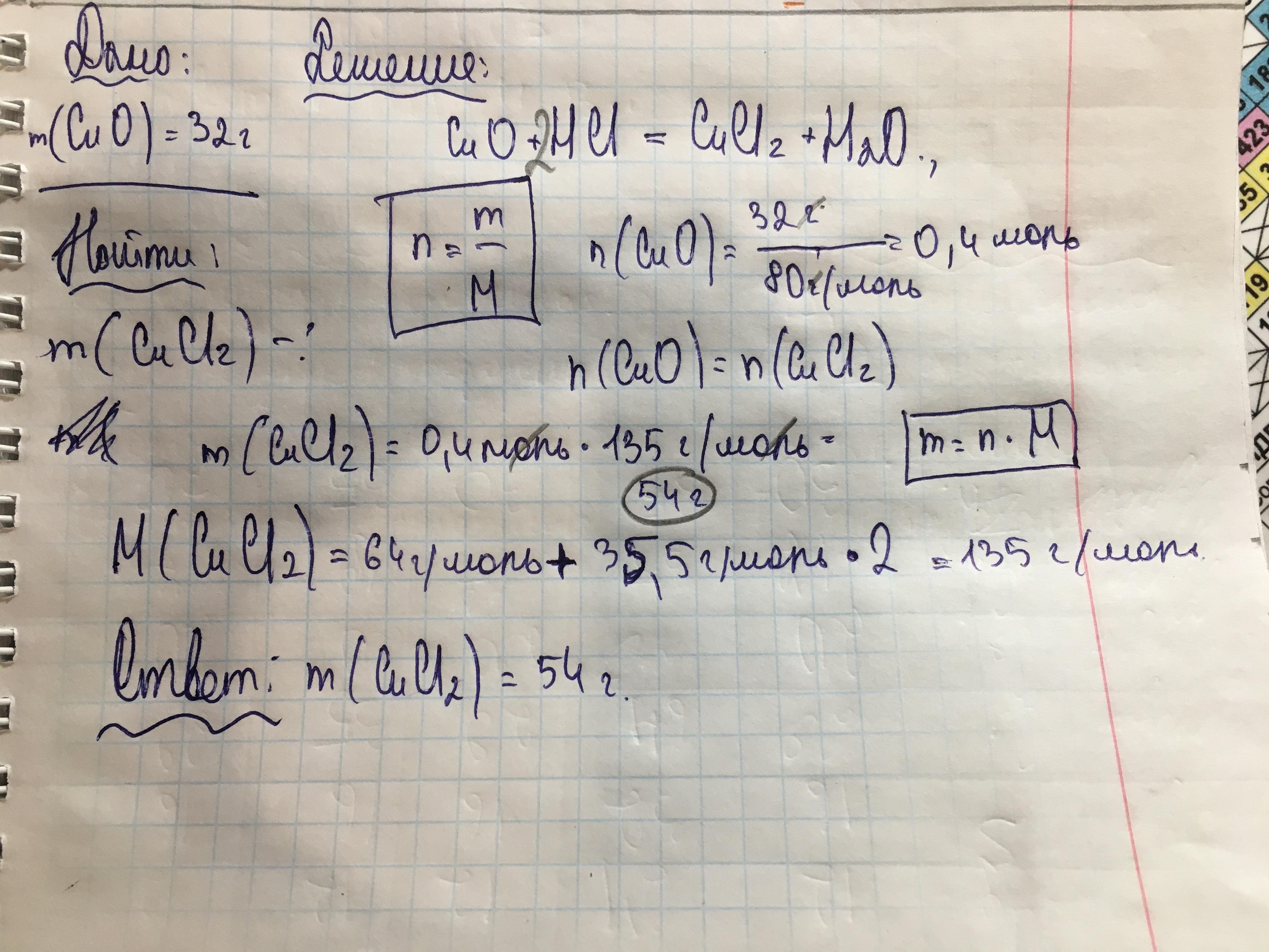 ...Текст задачи: "Оксид меди(II) массой 32 г прореагировал с раствором соляной кислоты. В результате образовался хлорид меди (II) и вода. Определите массу соли меди."