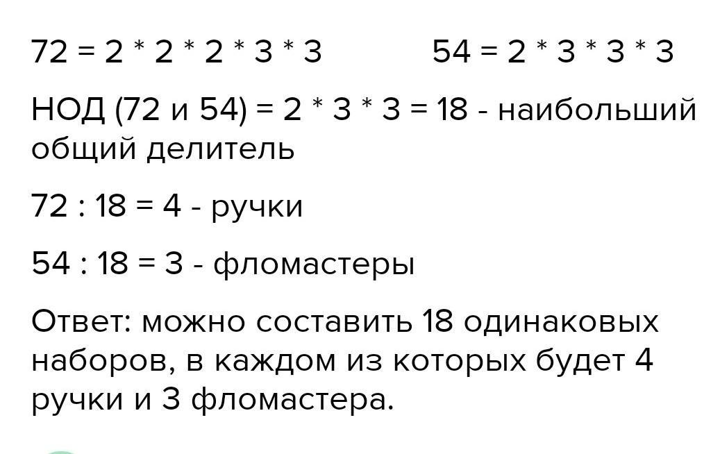 Какое наибольшее число одинаковых наборов можно составить из 72 ручек и 54 фломастеров, если они все должны быть использованы?