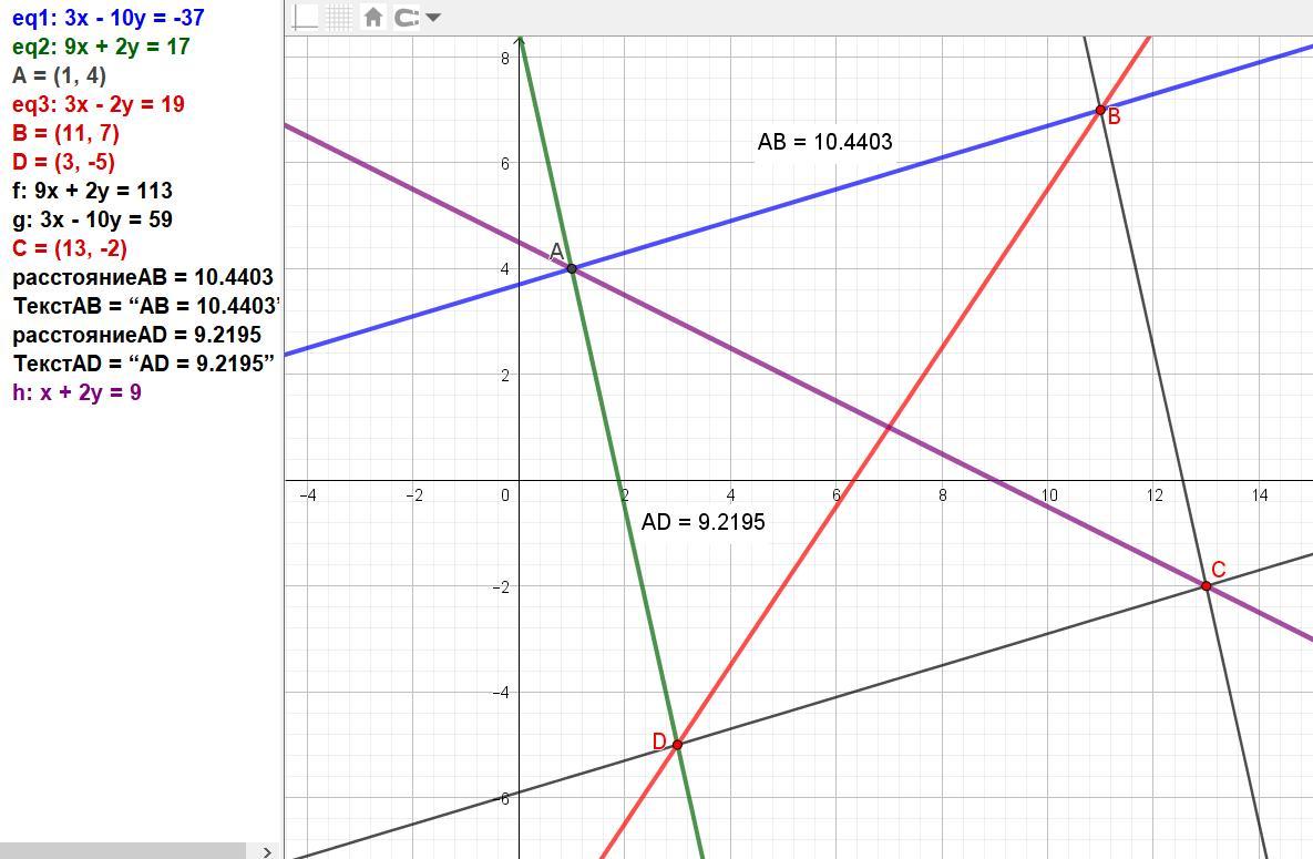Она параллельна заданной стороне AD и имеет равные коэффициенты перед переменными в уравнении общего вида Ax + By + C = 0.