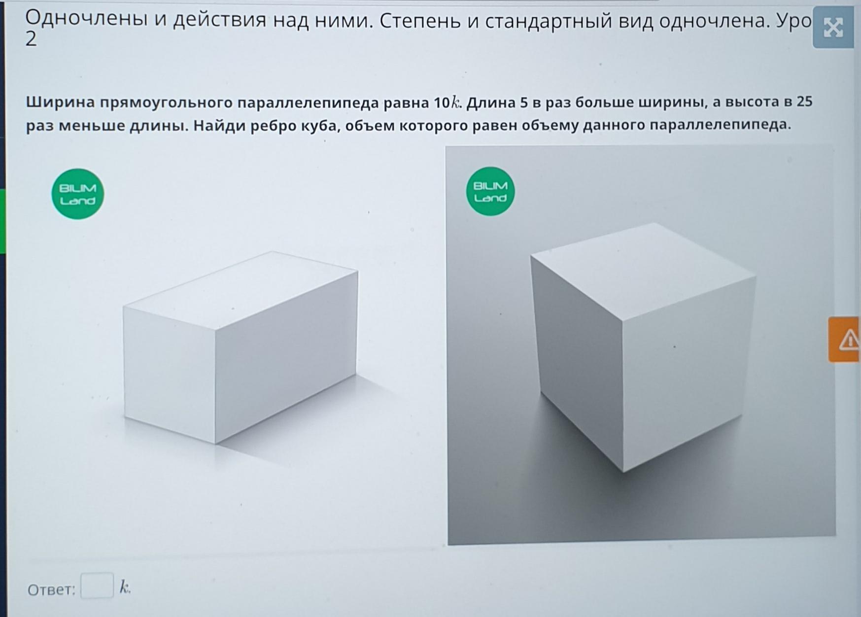Ширина прямоугольника параллелепипеда равна 10К . Длина 5 в раз больше ширины , а высота в 25 раз меньше длины найдите ребро куба объем которого равен объему данного параллелепипеда