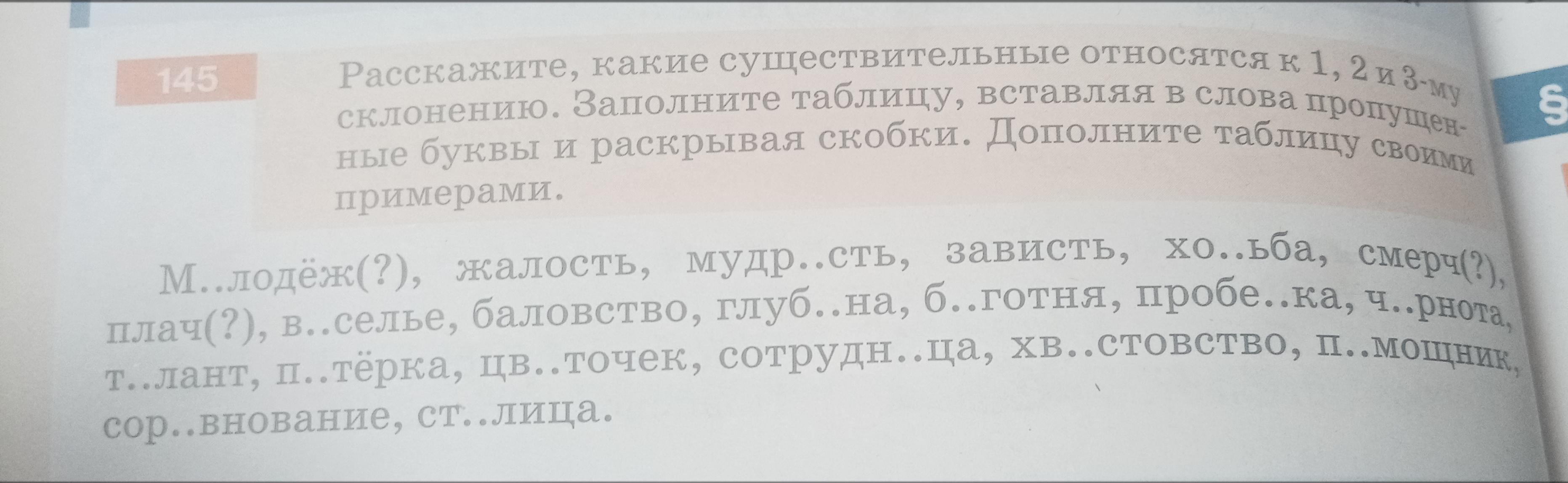 Расскажите, какие существительные относятся к 1,2 и 3-му склонению. Заполните таблицу, вставляя в слова пропущенные буквы и раскрывая скобки. Дополните таблицу своими примерами.