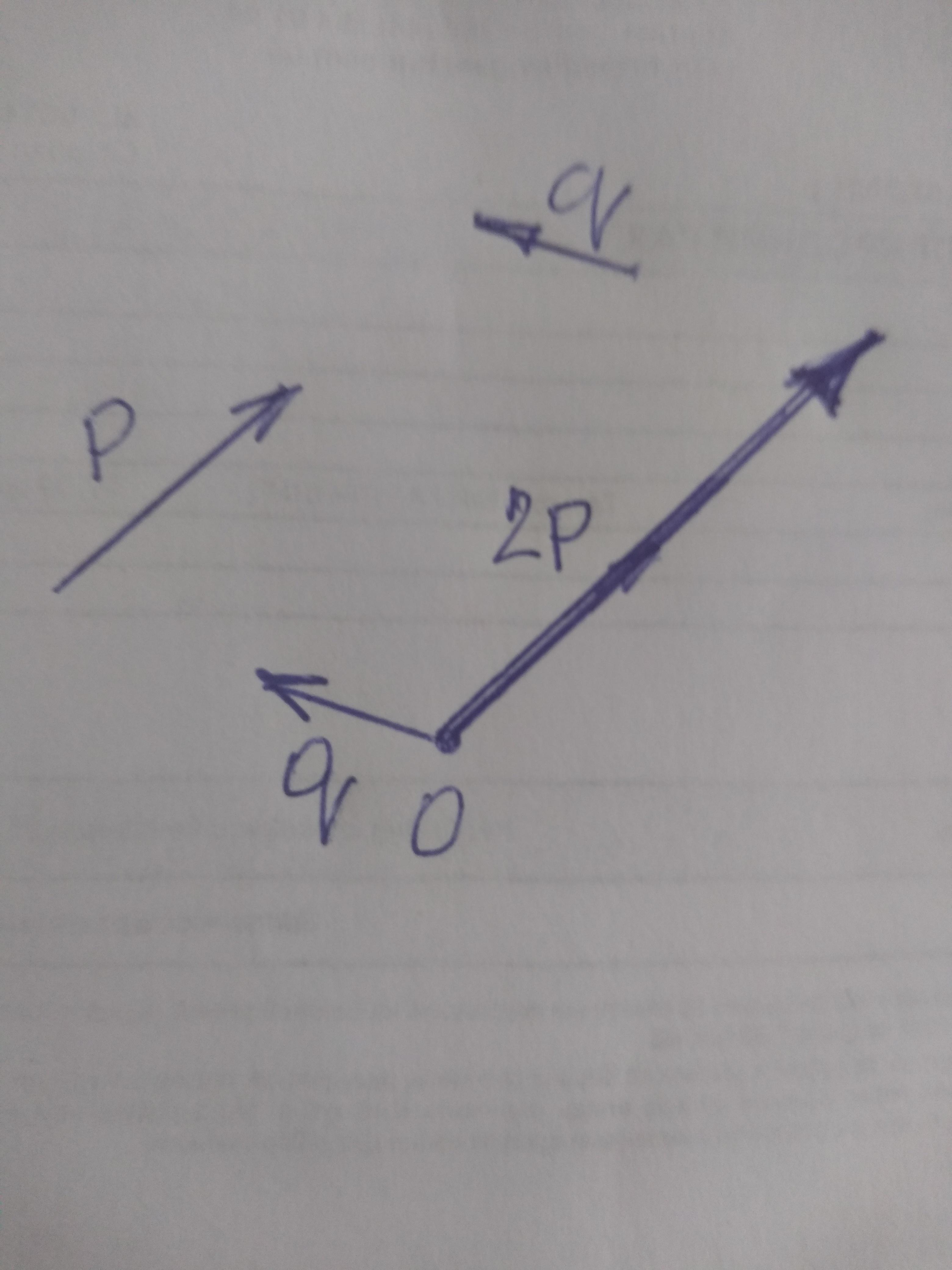 Нарисуйте два радиус-вектора p и q, начальные точки которых не совпадают, и обозначьте, какой то точка O. Из точки O расположить векторы равные 2p и 1/2 q.