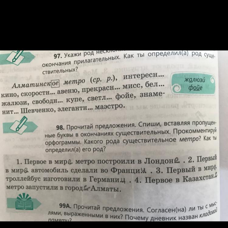 98.Прочитай предложения.Спеши,вставляя пропущенные буковы оканчаниях существительных.Прокомментируй орфорграмы.Какого рода существительное метро? Как ты определил(а) его род?