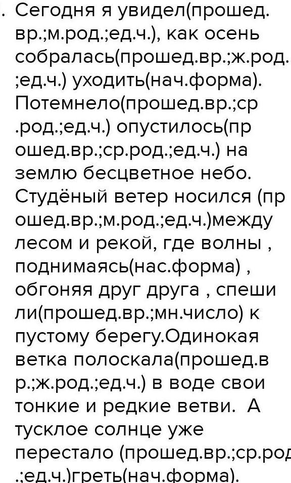 Прочитай текст. Допиши и выдели недостающие глаголов. Докажи, что задание сделано правильно: укажи время, род и число глаголов. Сегодня я увидел, как осень собрал съ ухо- и опустил землю бес- Цветное небо. Студёный ветер носился между ле- и рекой. Волны, поднимаясь, обгоняя друг друта, спешил пустому берегу. Одинокая ветла полоскал воде Свои тонкие и редкие ветви. А тусклое солнце уже перестал греть. (По Н. Григорьевой) • Выпиши предложение, соответствующее схеме. Что сделало? и что сделало? куда? какое? что? к B Составь подобную схему к третьему предложению.