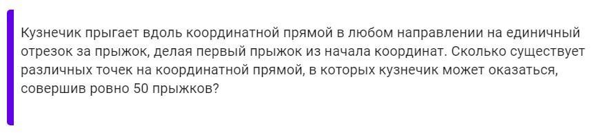 Ответ:Обозначим через 1 прыжок кузнечика в одну сторону координатой прямой, а через -1 – в противоположную сторону этой прямой. Общее число вариантов его перемещений будет равно , а различных точек: