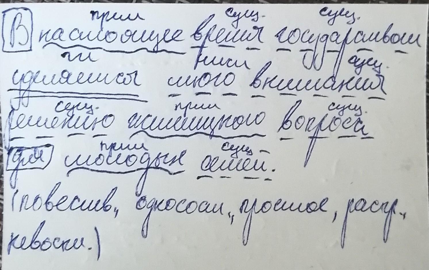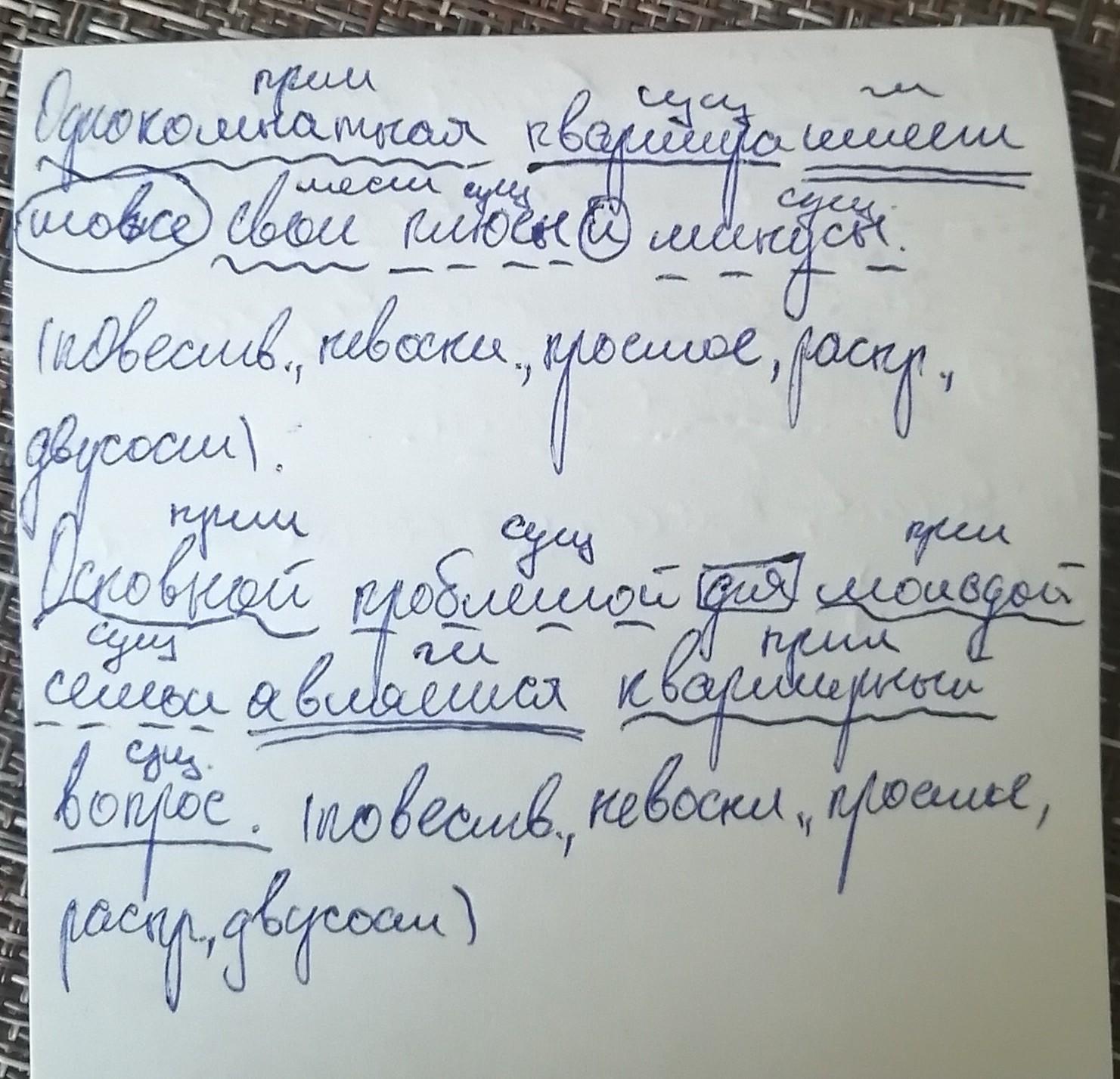 4. Сделайте синтаксический разбор предложений Однокомнатная квартира имеет тоже свои плюсы и минусы. Основной проблемой для молодой семьи является квартирный вопрос. В настоящее время государством уделяется много внимания решению жилищного вопроса для молодых семей.