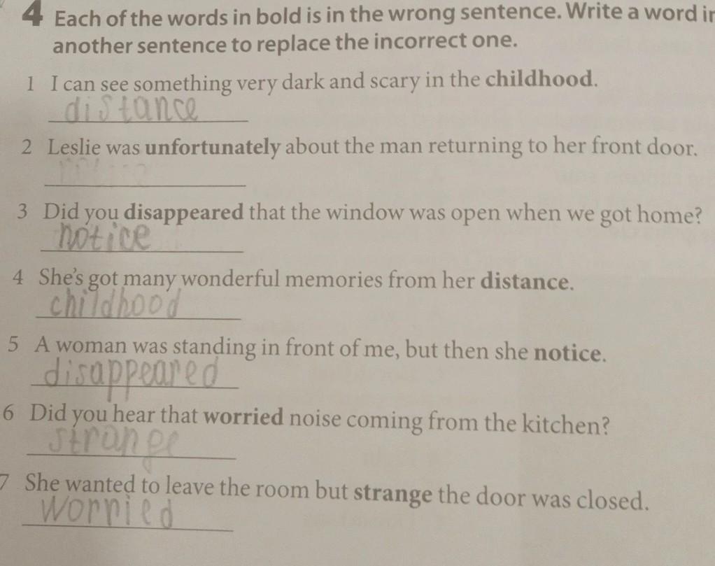 4 Each of the words in bold is in the wrong sentence.Write a word in bold from another sentence to replace the incorrect one. 1 I can see something very dark and scary in the childhood. was coming She (6) was house. Whe / was open what was he (8) watched the screams 2 Leslie was unfortunately about the man returning to her front door. 3 Did you disappeared that the window was open when we got home? 4 She's got many wonderful memories from her distance. 5 A woman was standing in front of me, but then she notice. 6 Did you hear that worried noise coming from the kitchen? 7 She wanted to leave the room but strange the door was osed.