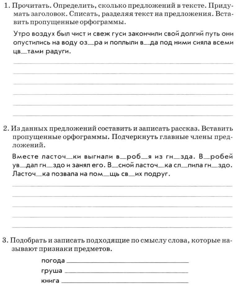 2) Весной ласточка слепила гнездо (ласточка - подлежащее, слепила - сказуемое). Воробей увидал гнездо и занял его (воробей - подлежащее, увидал и занял - сказуемые). Ласточка позвала на помощь своих подруг (ласточка - подлежащее, позвала - сказуемое). Вместе ласточки выгнали воробья из гнезда (ласточки - подлежащее, выгнали - сказуемое).