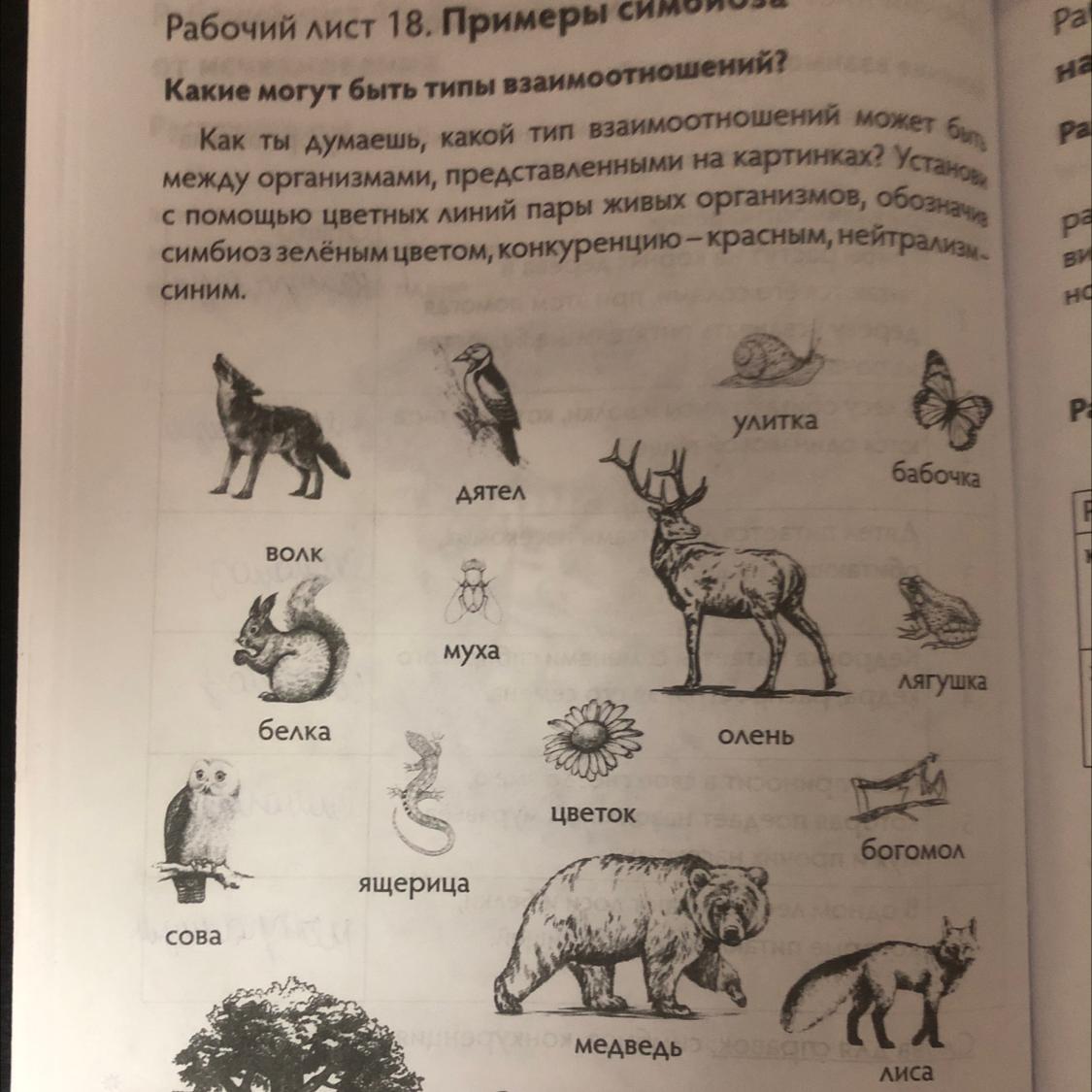 Цветок и бабочка(симбиоз),Медведь и дятел(нейтрально),дерево и дятел(симбиоз),волк и лиса(конкуреция), лиса и червь (конкуренция)