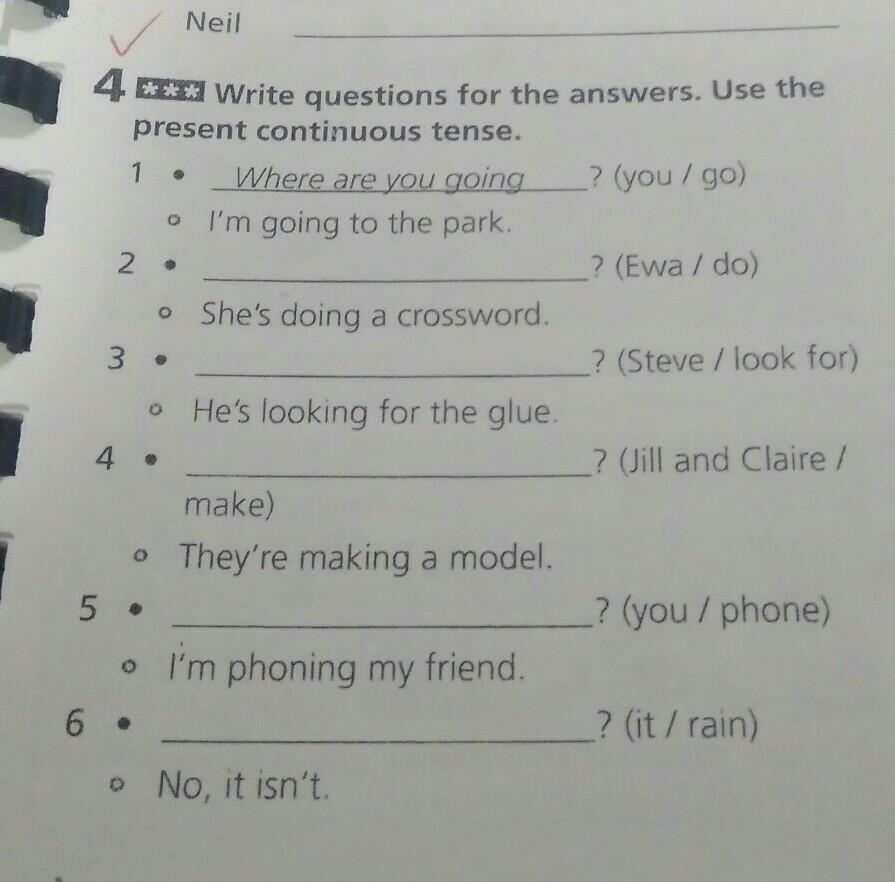 2 4 Write questions for the answers. Use the present continuous tense. 1 . Where are you going ? (you/go) I'm going to the park. ? (Ewa / do) • She's doing a crossword 3 ? (Steve / look for) He's looking for the glue 4 .? (Jill and Claire / make) • They're making a model. 5 ? (you / phone) • I'm phoning my friend. 6 ? (it/rain) No, it isn't.