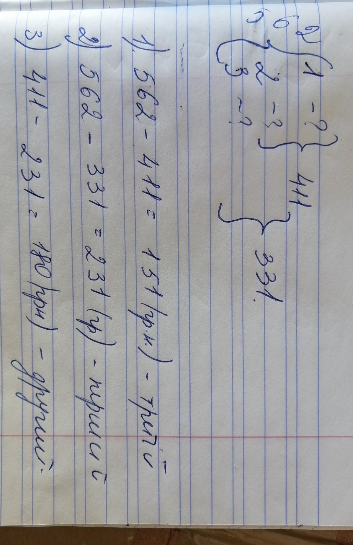 Троє фермерів заплатили за добрива 562 грн.Перший і другий заплатили 411( три десятих)грн, другий і третій-331(дві п'ятих)грн.Скільки грошей заплатив кожний?Допоможіть тому,що я не повністю розумію як це робити