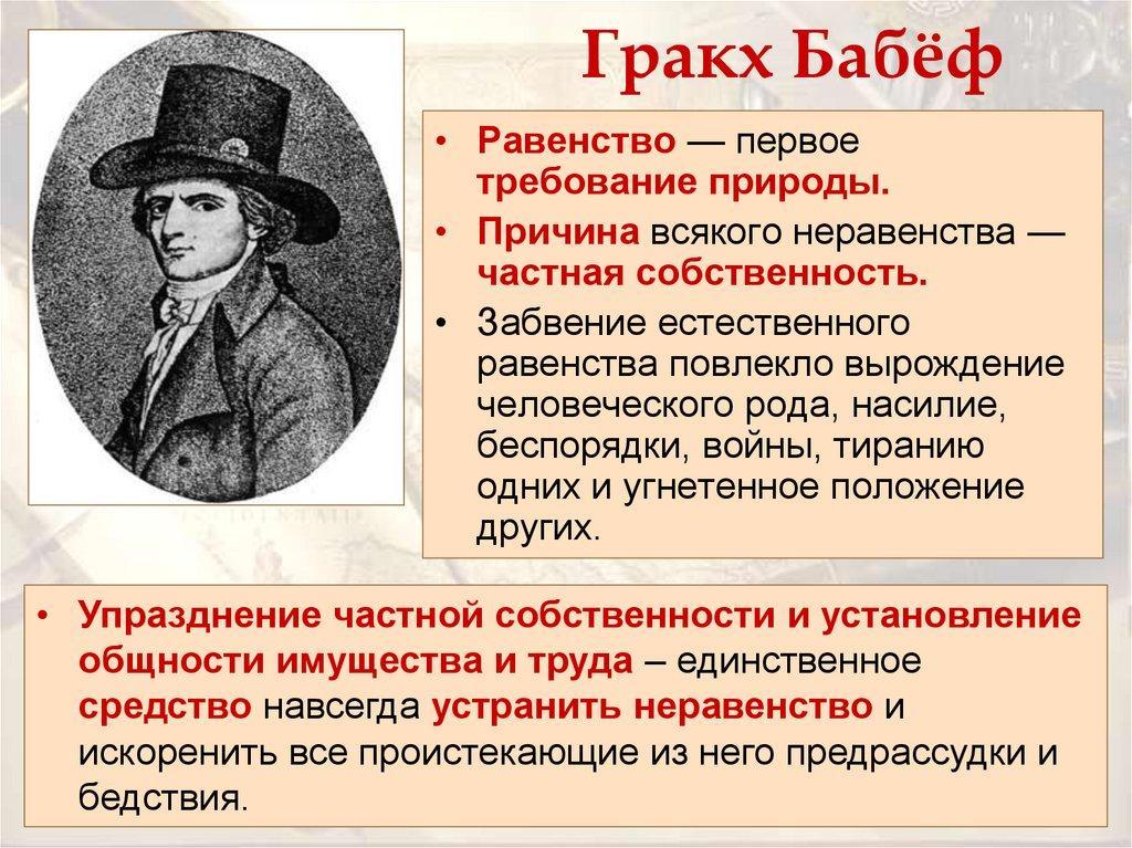 Гракха Бабефа часто считают первым коммунистом, поскольку он требовал уничтожения частной собственности.