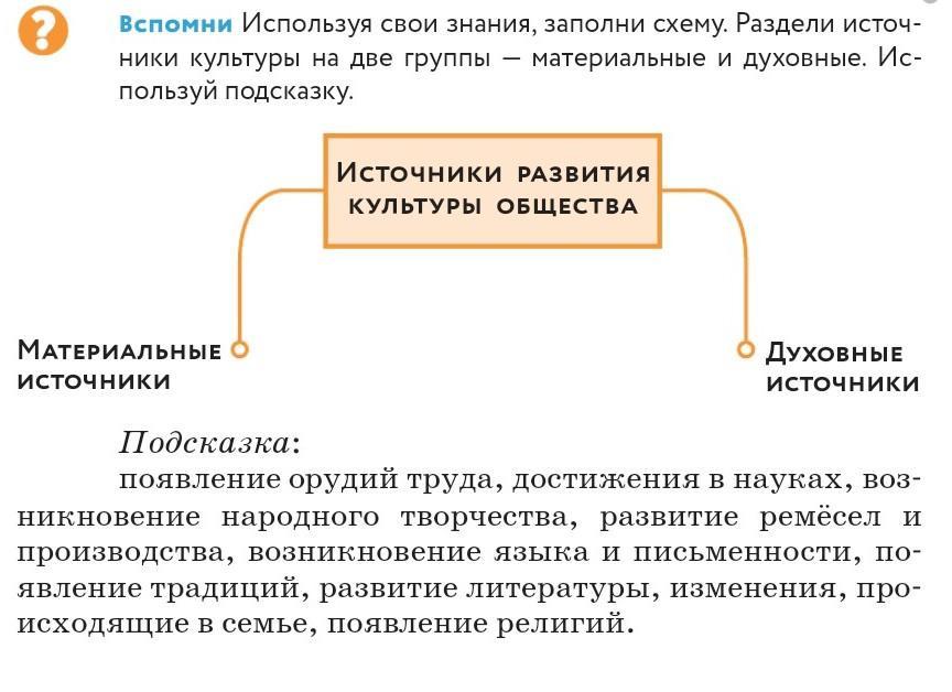 в материальные источники : все, кроме возникновение народного творчества, возникновение языка и письменности, появление традиций, развитие литературы, изменения, происходящие в семье и появление религий. соответственно, во второй столбик то, что не выписала в первый