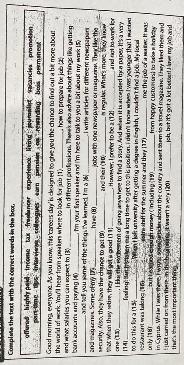 Good morning, everyone. As you know, this 'careers day' is designed to give you the chance to find out a bit more about the world of work. You'll hear from speakers where to look for job (1) vacancies, how to prepare for job (2) interviews and what salaries you can expect to (3) earn in different positions. There's also advice about things like getting bank accounts and paying (4) tax. I'm your first speaker and I'm here to talk to you a bit about my work (5) experience and tell you some of the things I've learned. I'm a (6) journalist. I write articles for different newspapers and magazines. Some of my (7) colleagues have (8) permanent jobs with one newspaper or magazine. They like the security. Also, they have the chance to get (9) promotion and their (10) income is regular. What's more, they know that when they retire, they will get a good. (11) pension However, I prefer to be a (12) freelancer and not to work for one (13) boss. I like the excitement of going anywhere to find a story. And when it is accepted by a paper, it's a very (14) rewarding feeling! But it's taken me a long time to get to this position. I didn't know when I was younger that I wanted to do this for a (15) living. When I left university after getting a degree in English, I couldn't find a job. My local restaurant was taking (16) on extra staff for the summer and they (17) offered me the job of a waiter. It was only (18) part-time but I earned enough salary (including (19) tips from happy customsers) to take a holiday in Cyprus. While I was there, I wrote some articles about the country and sent them to a travel magazine. They liked them and I just carried on from there. In the beginning, it wasn't a very (20) highly paid job, but it's got a lot better! I love my job and that's the most important thing.