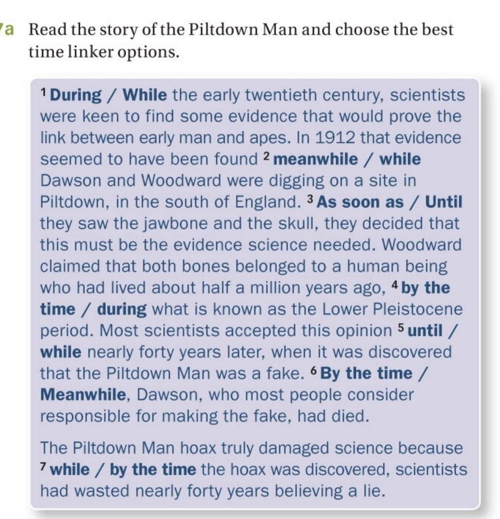 During the early twentieth century, scientists were keen to find some evidence that would prove the link between ‘early man and apes. In 1912 that evidence seemed to have been found while Dawson and Woodward were digging ‘on a site in Piltdown, in the south of England. As soon as they saw the jawbone and the skull, they decided that this ‘must be the evidence science needed. Woodward claimed that both bones belonged to a human being who had, lived about half a million years ago, during what is known as the Lower Pleistocene period. Most scientists accepted this opining until nearly forty years later when is was discovered that the Piltdown Man was a fake. Meanwhile Dawson who most people consider responsible for making the fake had died. The Piltdown Man hoax truly damaged science because by the time the hoax was discovered scientists had wasted nearly forty years believing a lie.