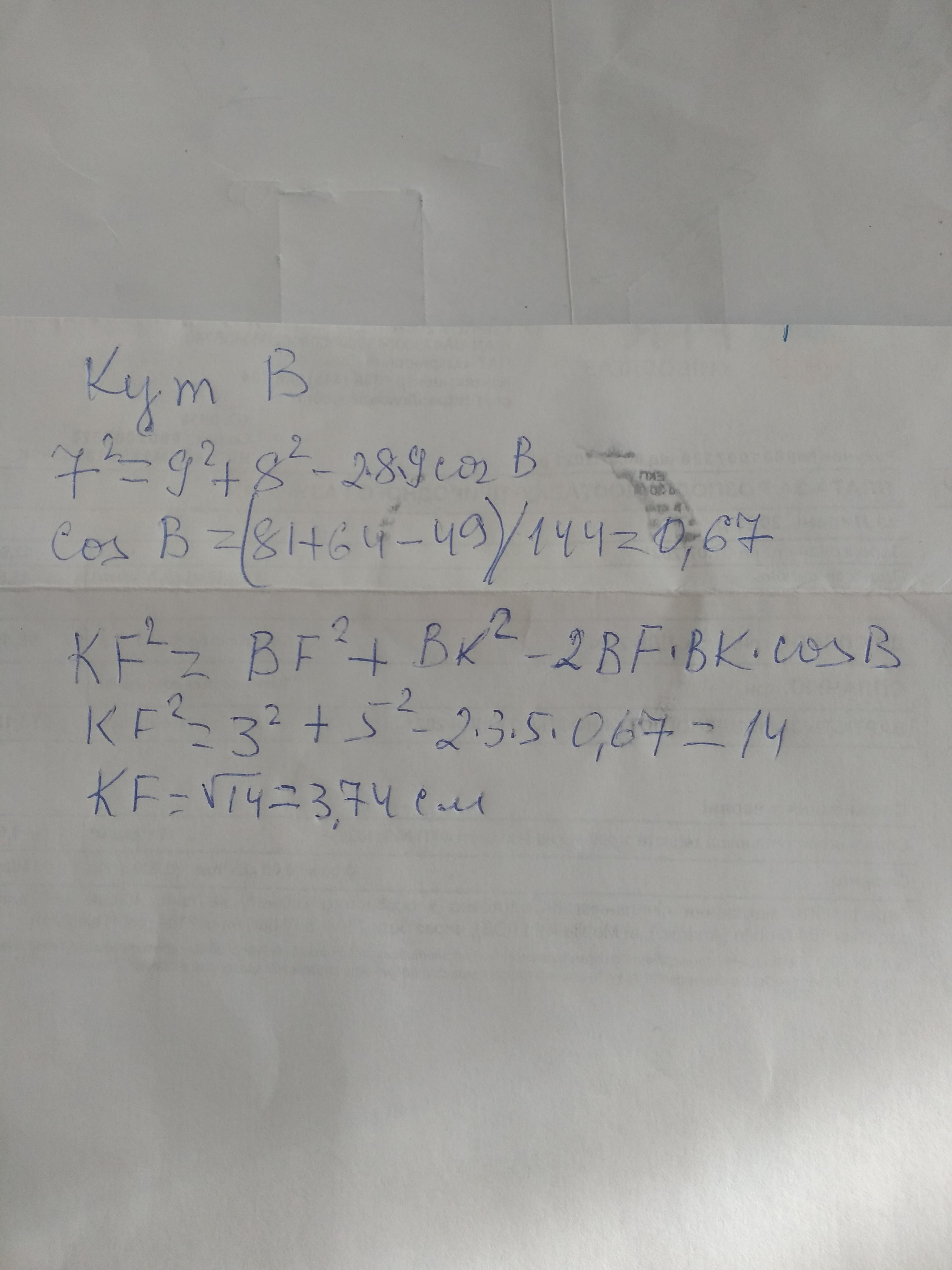 На сторонах АВ і ВС трикутника АВС позначено відпо вiдно такi точки к i F, що BK = 5 см, FC = 6 см. Знайдіть вiдрiзок KF, якщо АВ = 8 см, ВС = 9 см, АC = 7 см.