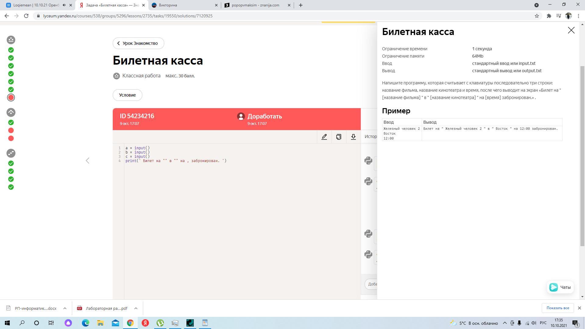 Напишите программу, которая считывает с клавиатуры последовательно три строки: название фильма, название кинотеатра и время, после чего выводит на экран «Билет на " [название фильма] " в " [название кинотеатра] " на [время] забронирован.» .