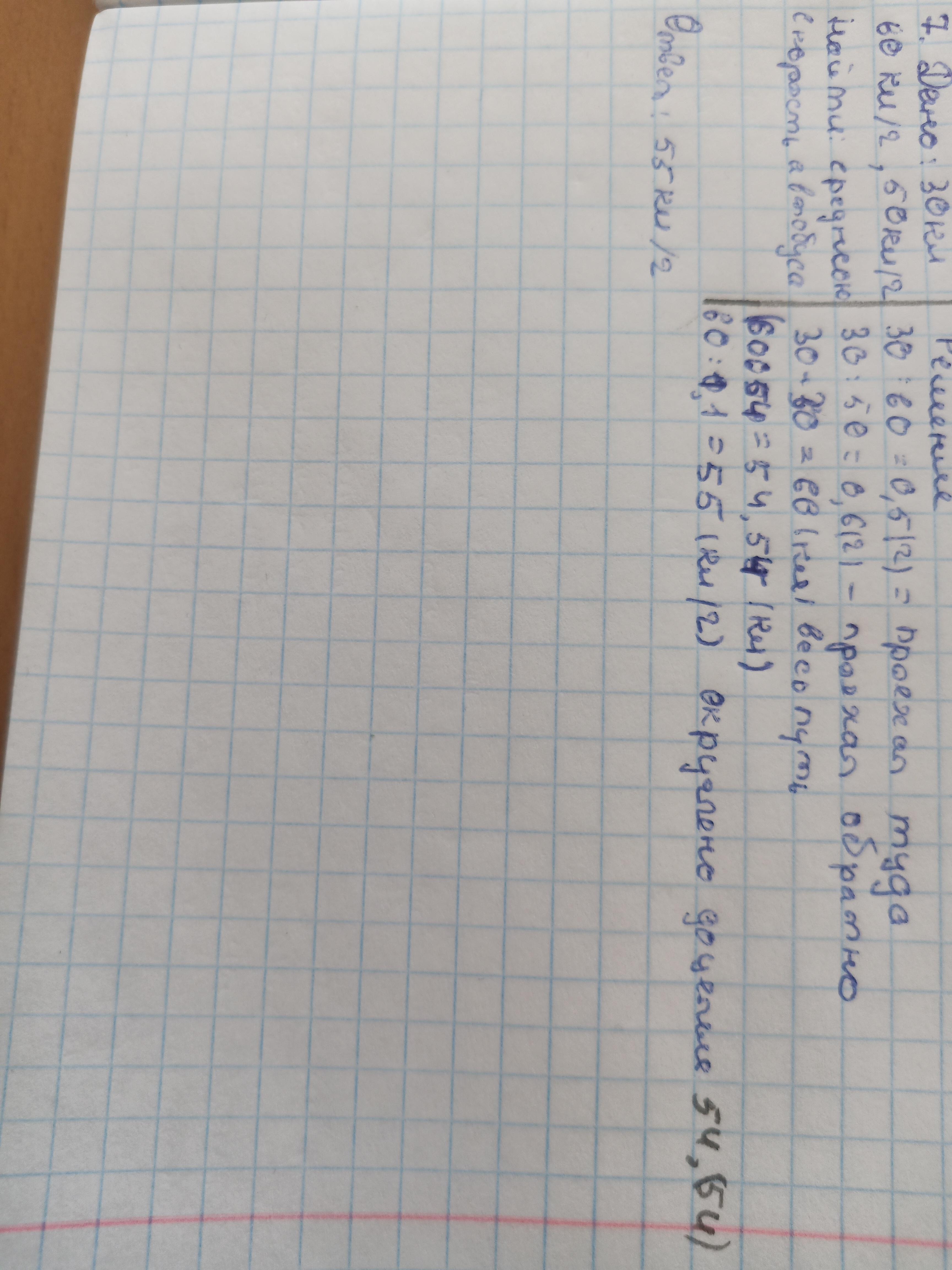 Автобус проходит 30 км между двумя поселками со скоростью 60 км/ч.в обратном направлении этот путь он проходит со скоростью 50км/ч.найдите среднюю скорость аатобуса за все время движения.