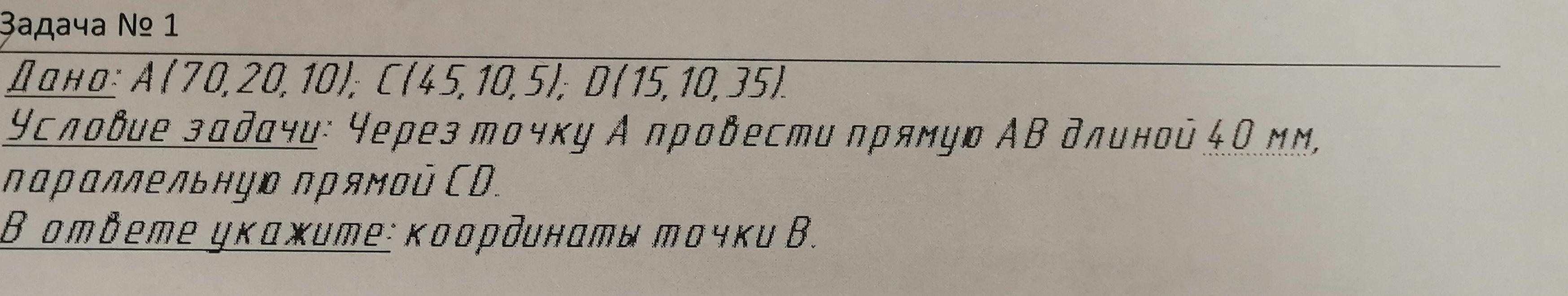 Далее, используя свойство - параллельность прямых при проецировании сохраняется, из точки А проводим прямую, параллельную CD, и на фронтальной проекции откладываем от точки А отрезок длиной 40 мм.