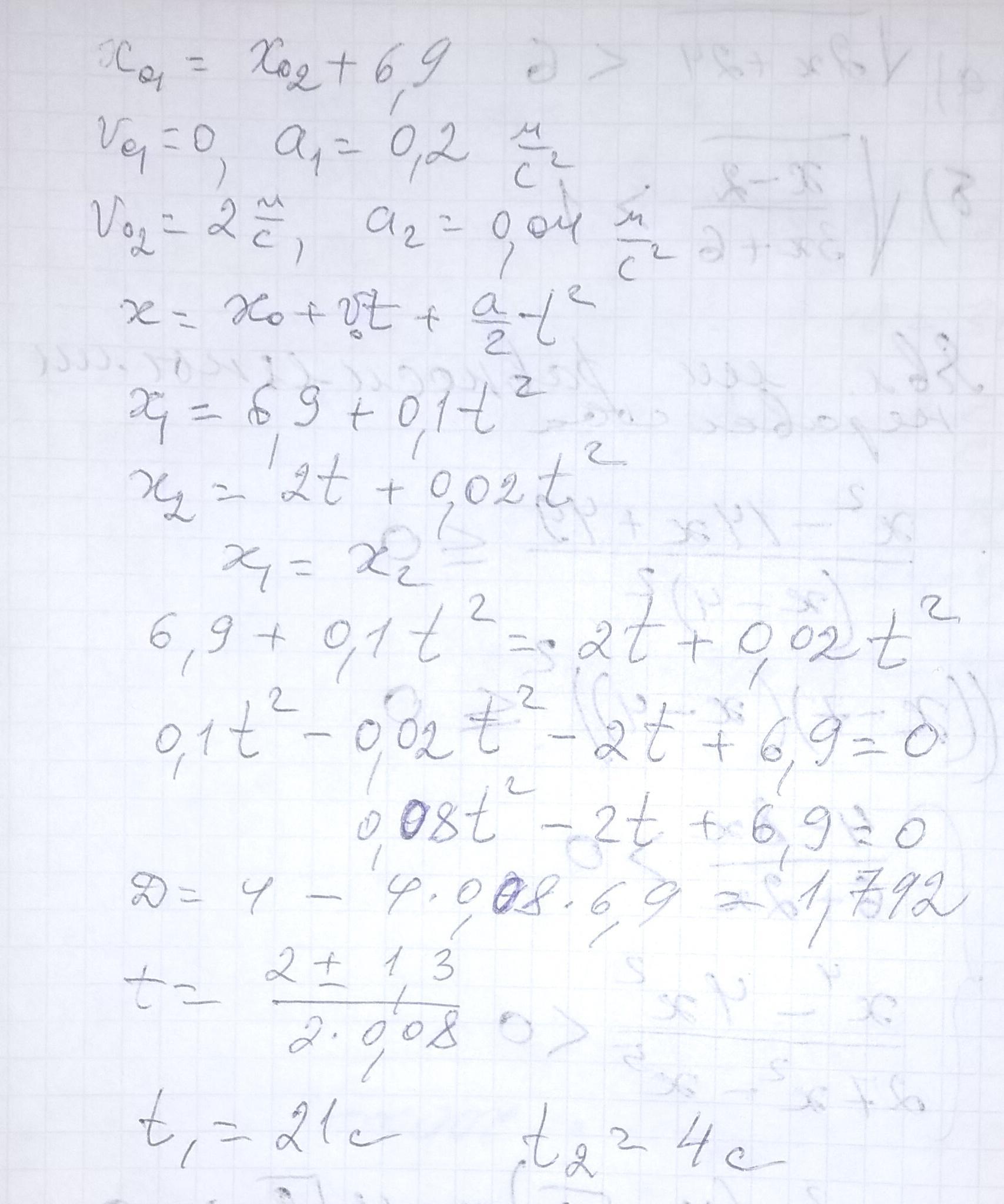 в момент начала наблюдения расстояние между двумя телами равно 6.9 М первое тело движется из состояния покоя с ускорением 0.2м/с^2 второе движется вслед за ним имея начальную скорость 2м/с и ускорение 0.04м/с^2 напишите координаты тел принимают значения в которой при t=0 x1=6.9м x2=0 найти время и место встречи тел