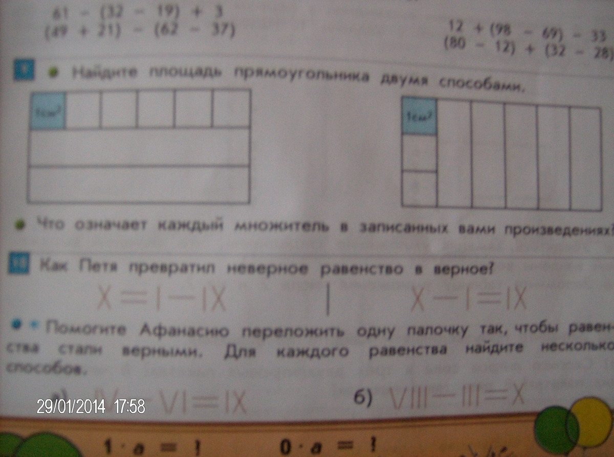 Вырезаете мерку в 1см2 (это квадрат со сторонами 1см) и в каждый столбец подставляете столько раз, что бы заполнить весь прямоугольник. Получается всего 18 раз соответственно прямоугольник равен 18см2.
