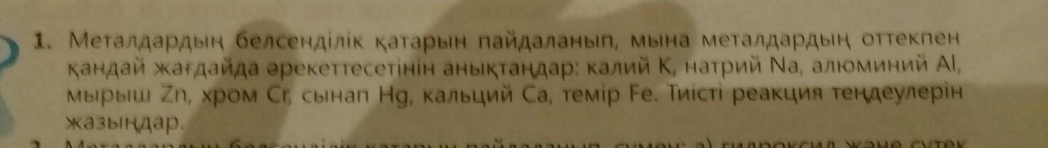 Металдардын белсендылык катарын пайдаланып,мына металдардын оттекпен кандай жагдайда арекетесетынын аныктандар:Калиий :К ,Натрий Na, алюминий Al,мырыш Zn, хром Xr , сынап Hg, кальций Ca, темыр Fe, .Тиысты реакций тендеулерын жазындар.отыныыыщ катты кажееет