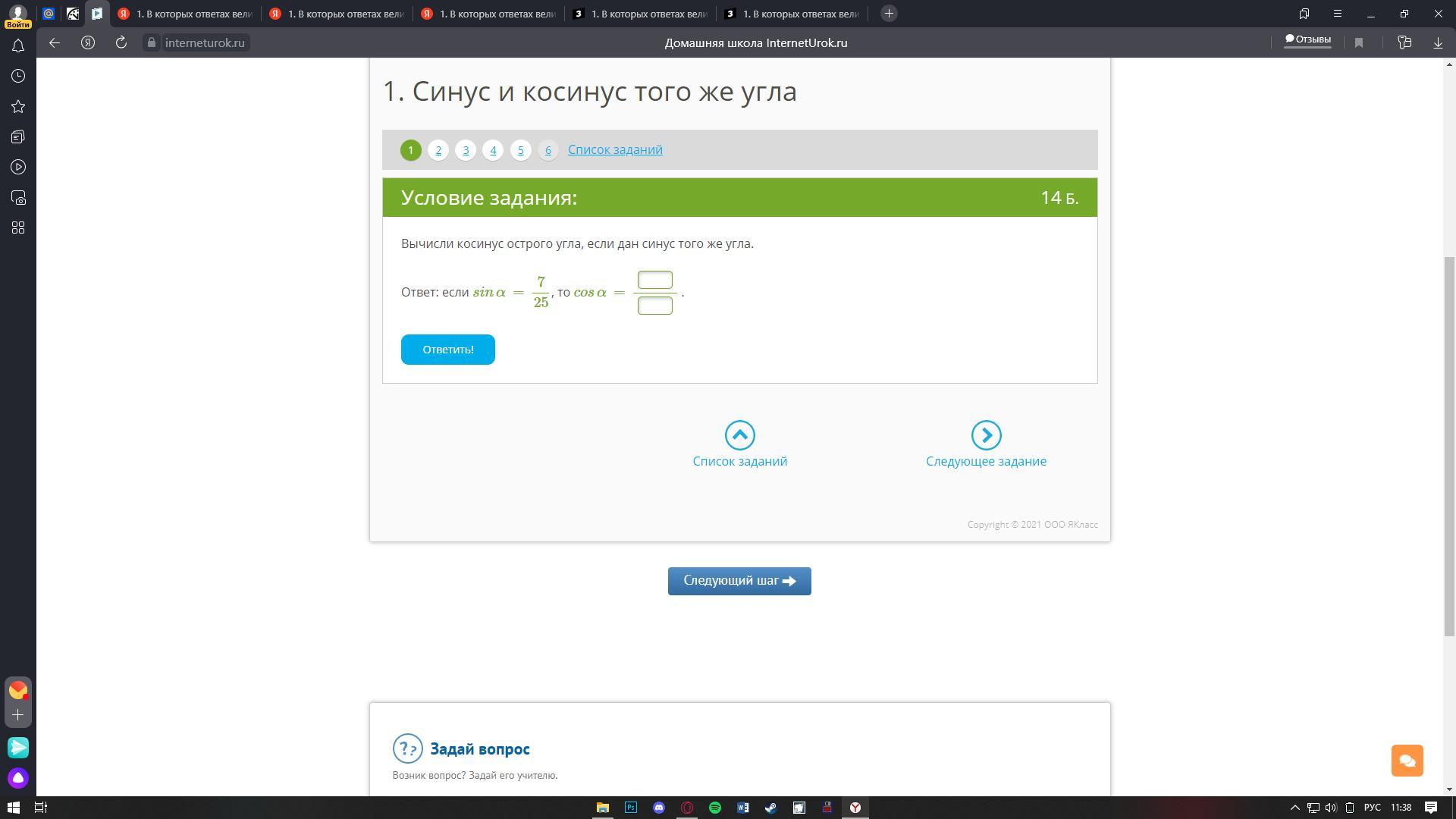 cosα = + √( 1 - sin²α ) = √( 1 - ( 7/25 )² ) = √( 1 - 49/625 ) = √( 576/625 ) = 24/25 ;