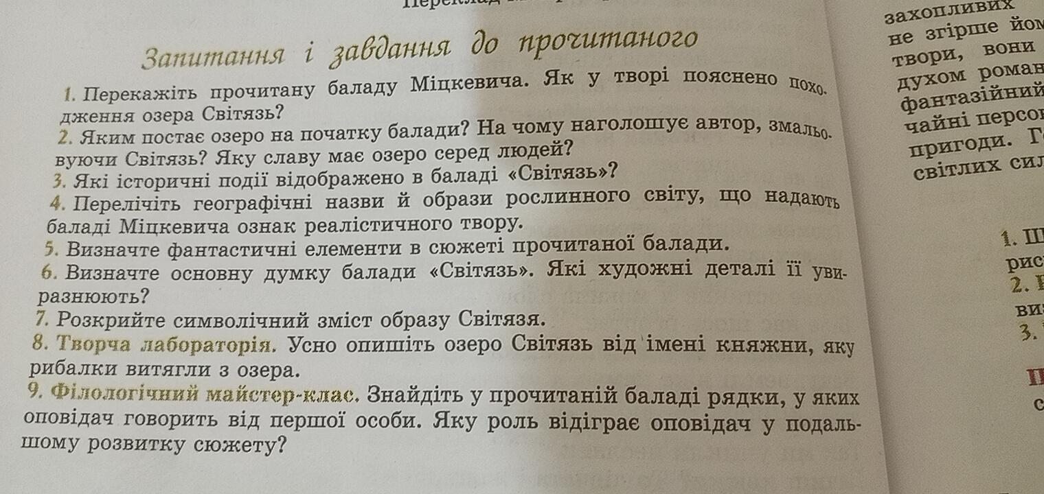 Відповідь: 1. Вороги напали на Світязь. Нікому було його обороняти, бо князь зі своєю дружиною пішов допомогти в нерівній боротьбі другові- сусідньому князю. Залишилися в місті лише діди, жінки з дітьми та юна княгиня. Не хотіли волелюбні жителі міста загинути від руки загарбника, жити в неволі, зазнати глуму та знущань. Тому вирішили прийняти смерть. Озеро поглинуло їх, даруючи безсмертя. На воді одразу з’явилися квіти. Вороги зривали їх, але падали мертві. І досі на водах Світязя милується Божим Світлом чудове латаття, нагадуючи нащадкам про подвиг простих жінок, про їх безмежну ї гордість, про любов до батьківщини.