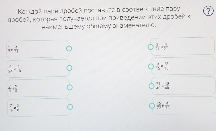 1/7 и 4/21 с 3/21 и 4/21, 5/24 и 1/18 с 15/72 и 4/72, 3/5 и 5/3 с 9/15 и 25/15, 7/16 и 5/6 с 21/48 и 40/48